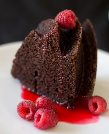 Black Garlic Chocolate Cake with Raspberry SaucePrep Time: 15 Min - Cook Time: 45 MinServes 12The Cake1 cup (225 grams) unsalted butter⅓ cup (40 grams) cocoa powder1 teaspoon salt1 cup (225 grams) water2 cups (240 grams) all-purpose flour1¾ cups (350 grams) sugar1½ teaspoons baking soda2 large eggs½ cup (120 grams) sour cream1 teaspoon vanilla extract1 head black garlic (For a less pungent flavour, start with half a head of black garlic and see if you're okay with more.)The Raspberry Sauce2 cups fresh raspberries. (frozen is fine if out of season)3 tablespoons sugar½ tablespoon lemon juiceInstructionsFor the cakePlace rack in the centre of the oven and preheat the oven to 180°CF., Butter and flour the inside of a 10-cup Bundt or ring cake tin.In a medium saucepan, combine butter, cocoa powder, salt, and water. Melt over medium heat, stirring to combine. Remove from heat and set aside.In a large mixing bowl, whisk together flour, sugar, and baking soda. Gradually pour in the chocolate mixture, whisking constantly with your opposite hand, until the mixture is smooth. Add eggs, one at a time, whisking until combined after each addition. Whisk in the sour cream and vanilla extract until smooth.Chop the head of black garlic in half, then remove cloves from the skin and place in a small mixing bowl. Mash cloves into a paste with the back of a spoon. Whisk the black garlic paste into the cake mixture until smooth.Pour the mixture into your prepared cake tin and bake until a toothpick or cake tester inserted in the cake comes out clean, 40-45 minutes. Place pan on a wire rack to cool for 15 minutes, then invert the cake onto the wire rack and let it cool completely.For the Raspberry SauceCombine all ingredients in a saucepan. Cook over medium heat, mashing the raspberries slightly, until raspberries are broken down, about 8-10 minutes. Remove from heat and strain into a liquid measuring cup through cheesecloth or a fine mesh strainer to remove the seeds.Pour over the top of the cake, then serve (with fresh raspberries, if desired).